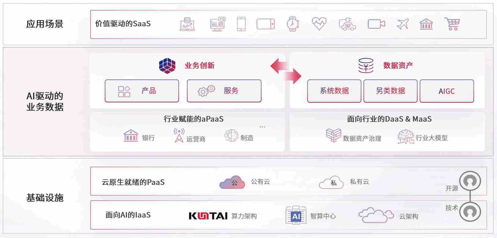 数字时代,,围绕企业数字化转型的关键要素,,,,尊龙旗舰厅数码开创性的提出数云融合战略和技术体系框架,,,,着力在云原生、、数字原生、、AI原生和信创产业上架构产品和服务能力,,,为处在不同数字化转型阶段的快消零售、、汽车、、、金融、、、医疗、、政企、、、教育、、、运营商等行业客户提供泛在的敏捷IT能力和融合的数据驱动能力,,构建跨界融合创新的数字业务场景和新业务模式,,,,助力企业级客户建立面向未来的核心能力和竞争优势,,全面推动社会的数字化、、、、智能化转型升级。。。