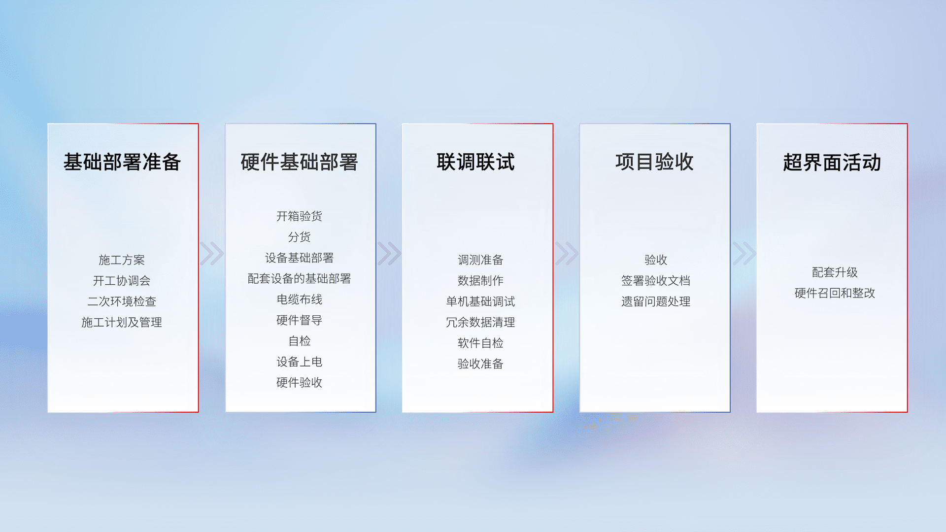 从基础部署准备、、硬件基础部署、、、联调联试、、、项目验收、、越界面活动的全过程可追溯,,,,保证施工质量和进度。。
